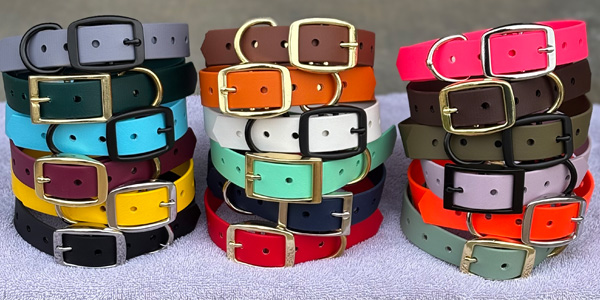 Under Control Company specializes in building sustainable dog collars, flat and martingale, made with BioThane®️ coated webbing and stainless steel hardware.